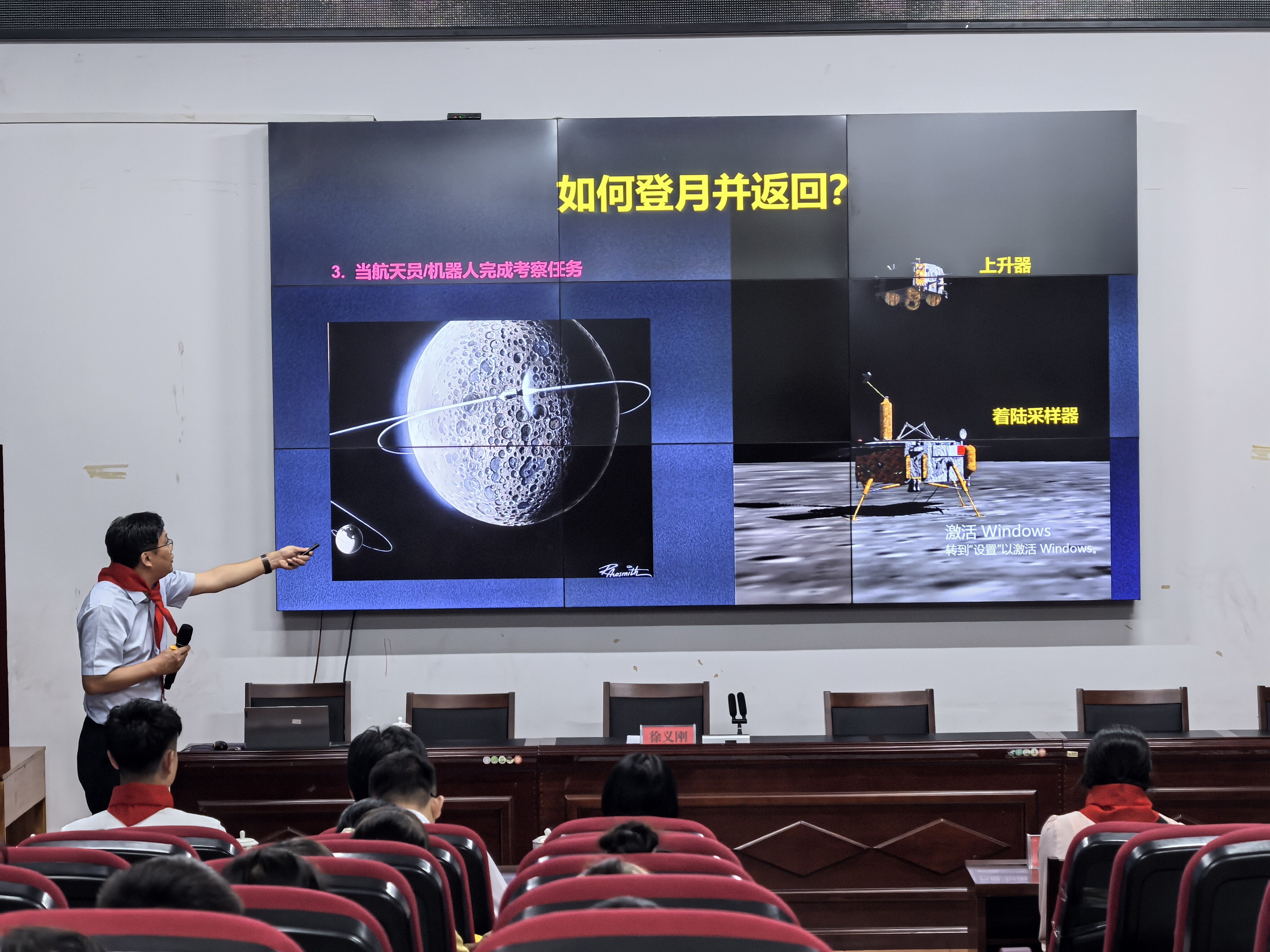 捐赠仪式后,徐义刚院士以《地月对话——从“阿波罗”到“嫦娥”探月》为题,带来一场沉浸式科普讲座。他结合历史影像与工程案例,从美国阿波罗登月的探索历程,讲到中国嫦娥探月工程的自主创新与辉煌成就,用生动通俗的语言拆解宇宙奥秘,激发孩子们对科学探索的兴趣。