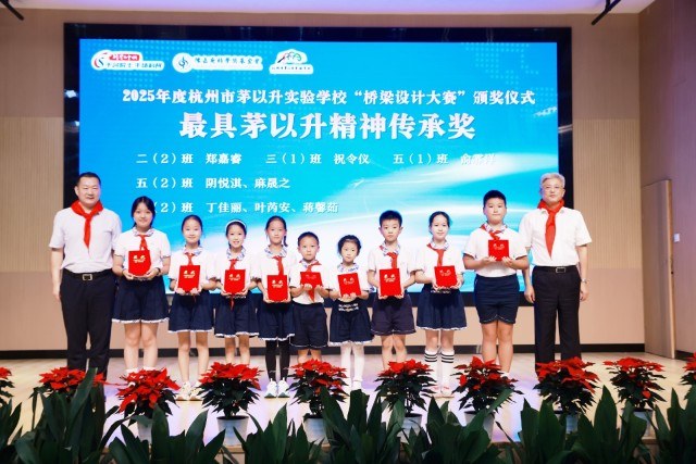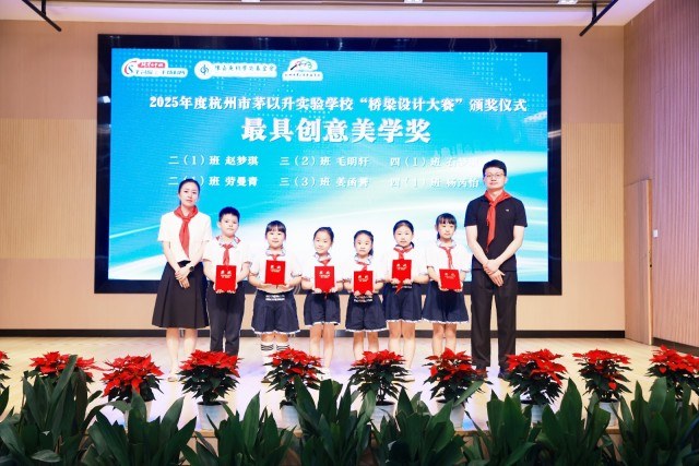 互动结束后,学校2025年度校园桥梁设计大赛颁奖环节拉开帷幕。这个假期,孩子们以“像茅爷爷一样研究桥梁”为目标,有的泡在图书馆查桥梁资料,有的和家长一起找环保材料,有的为了让桥模更稳固,反复测试、调整结构,最终完成了128件充满巧思的作品。经评委从“创意、结构、实用、精神传承”四个维度评审,评选出“最具创意美学奖”“最具工程实践奖”“最具茅以升精神传承奖”三大奖项。