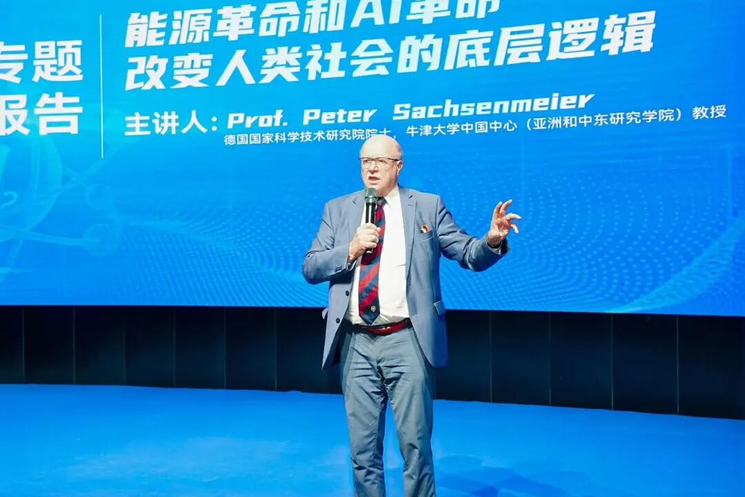 Peter Sachsenmeier则从全球和历史发展视角出发,作了“能源革命和AI革命改变人类社会的底层逻辑”的分享。凭借在科技、文化、教育多方面的丰富经验,他先从能源革命入手,继以分析AI以及人口加速减少的现状,预测能源、AI革命将给教育带来的新工具、新模式,展望教育革新。