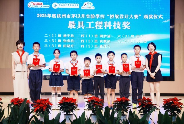 互动结束后,学校2025年度校园桥梁设计大赛颁奖环节拉开帷幕。这个假期,孩子们以“像茅爷爷一样研究桥梁”为目标,有的泡在图书馆查桥梁资料,有的和家长一起找环保材料,有的为了让桥模更稳固,反复测试、调整结构,最终完成了128件充满巧思的作品。经评委从“创意、结构、实用、精神传承”四个维度评审,评选出“最具创意美学奖”“最具工程实践奖”“最具茅以升精神传承奖”三大奖项。